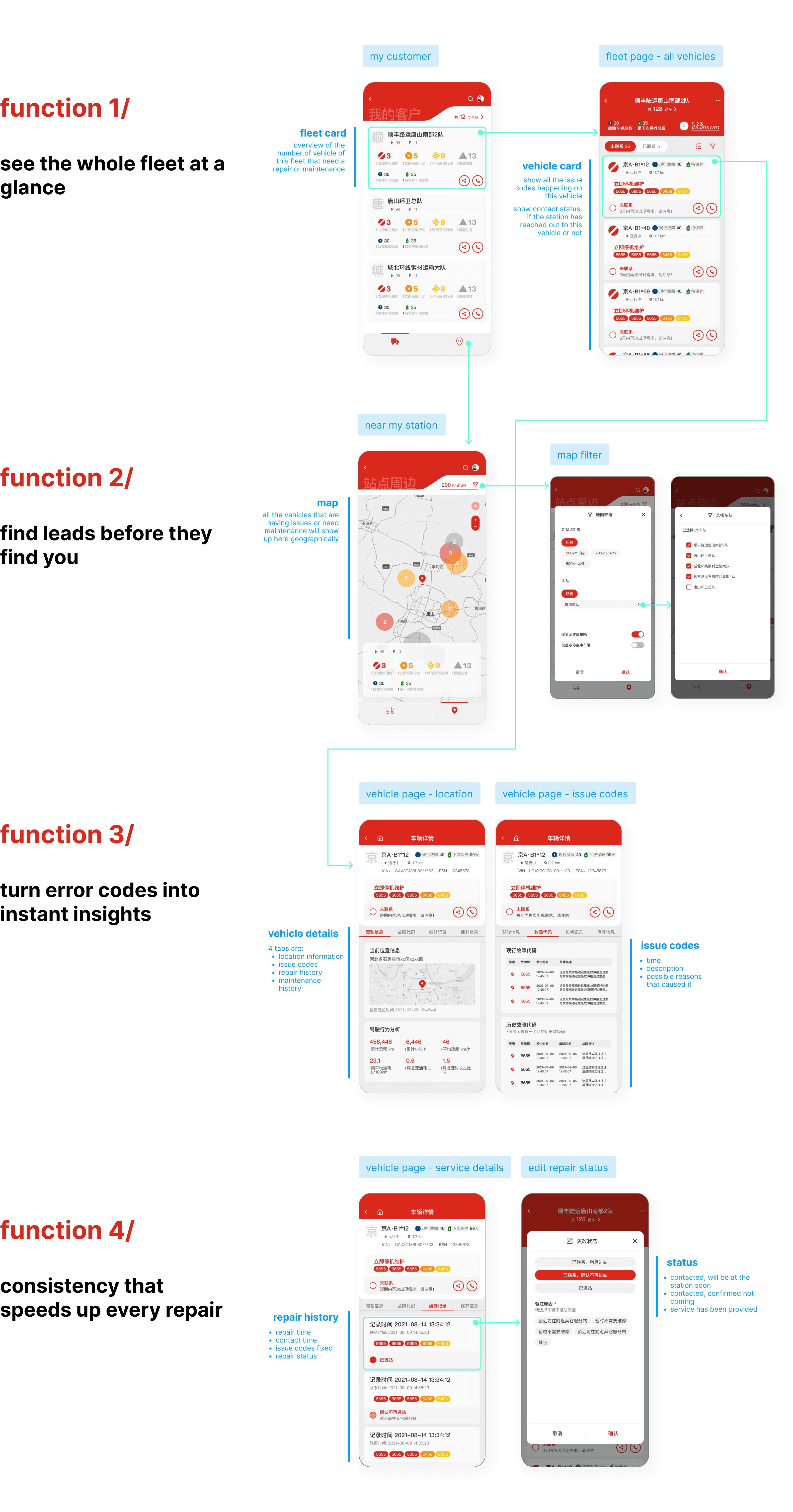 To maximize our field time, we translated user pain points into wireframes that directly mapped to the opportunities we identified—visualizing fleets, surfacing nearby leads, enabling faster diagnosis, and standardizing workflows. This ensured our exploration stayed closely aligned with real user needs while remaining lightweight for quick iteration.